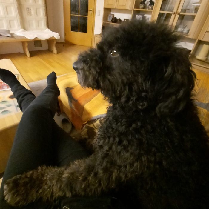 Als vermutlicher Pumi-Mischling und damit Hirtenhund bewacht er den Garten, kennt aber alle Nachbarn und bellt diese nicht an. Aber er bleibt wachsam. Er ist ein lebhafter Hund, kommt aber zu Hause auch sehr gut zur Ruhe und zeigt dann seine gemütliche Seite.